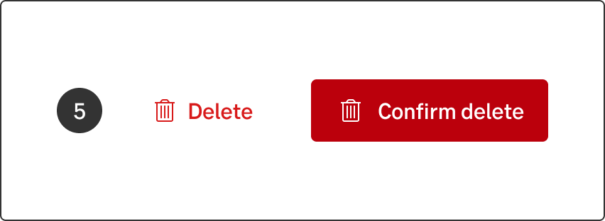 The delete button has two types. When users take this action, include an additional step in a dialogue modal where the user need to confirm the action. In this step, the delete button is solid red to clearly stand out to be the primary action in the modal. Also give the user the possibility to cancel the delete with a secondary button alternative.