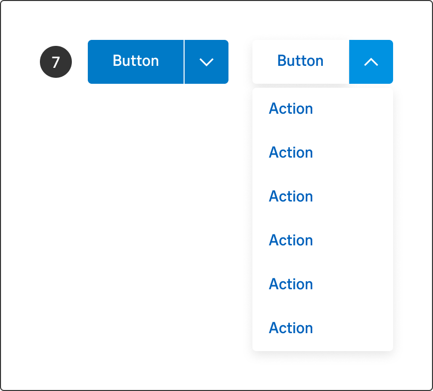 A split button groups related commands together into a list of actions and offers one-click access to a default choice that doesn't require opening the list. Split buttons are used when there are many actions available for the user, but not the space or real-estate to have individual buttons for each action. The list of options can be opened above or below the button and may overflow to either side of the button width, based on where the button is placed on the screen or in the flow. Avoid more than one split button in each flow.