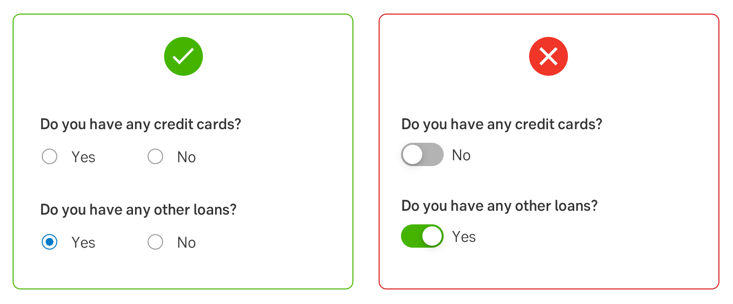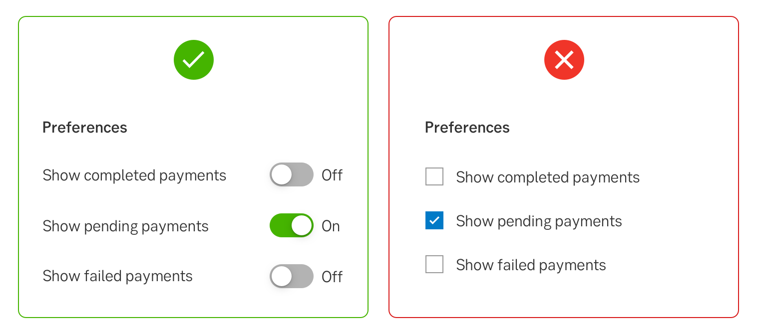 The slide toggle should be used when the user should be able to toggle a binary state of a setting or preference.