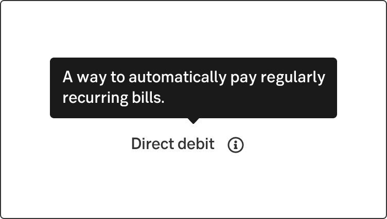Provides brief information related to the content. Tooltips are triggered when users hover their cursor over an underlined label, an icon or an image. Tooltips are text based. Best used for short information on for example what a label means.