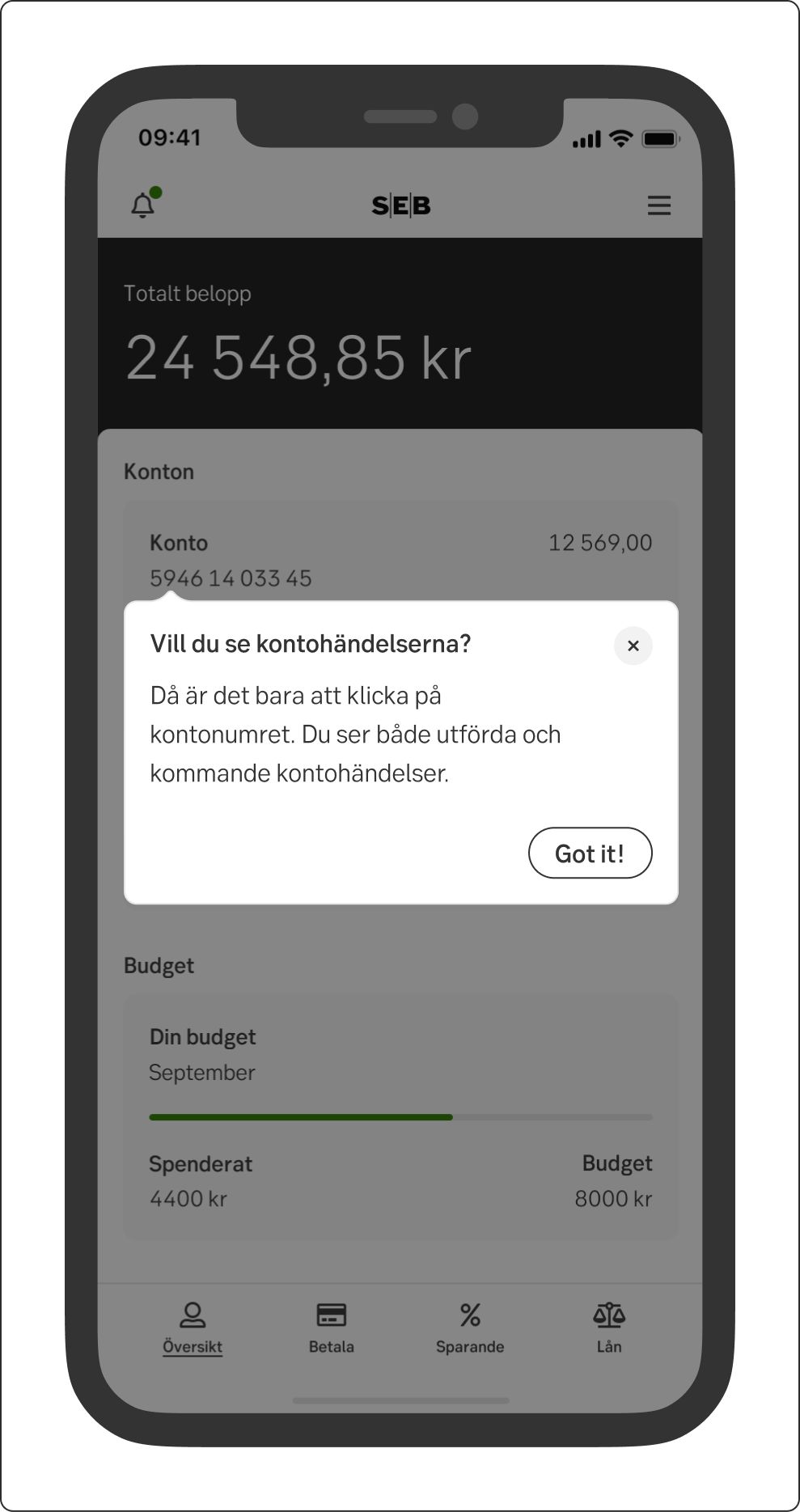 Contextual help in a modal can contain more information. The SEB contextual pattern prefer the Slide-out modal. Use it for example as a central help for a form when several input labels need more information, or for the presentation on a loan application on how we have calculated. Often used more of a “dig deeper” type of Contextual help.